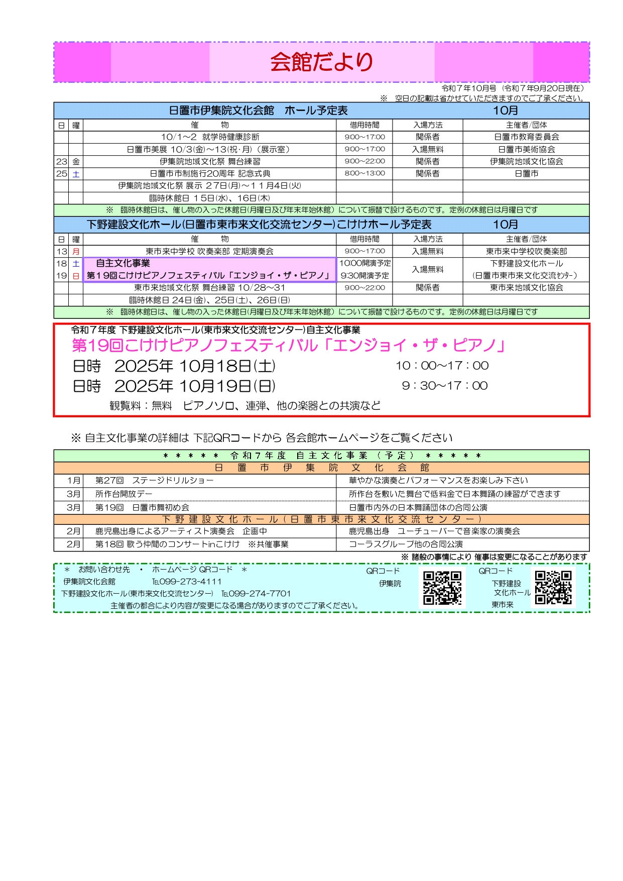 日置市伊集院文化会館と下野建設文化ホール(日置市東市来文化交流センター)の予定表や年間行事などを掲載して参ります。