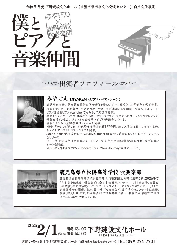トロンポーン参者とストリートピアノを巡るYouTuberの二刀流演奏家みやけんソロステージと、彼の出身校である松陽高校吹奏楽部メンバーとのコラポステージの2部場成。どんなステージが展開されるか、ぜひ会場でご覧ください!