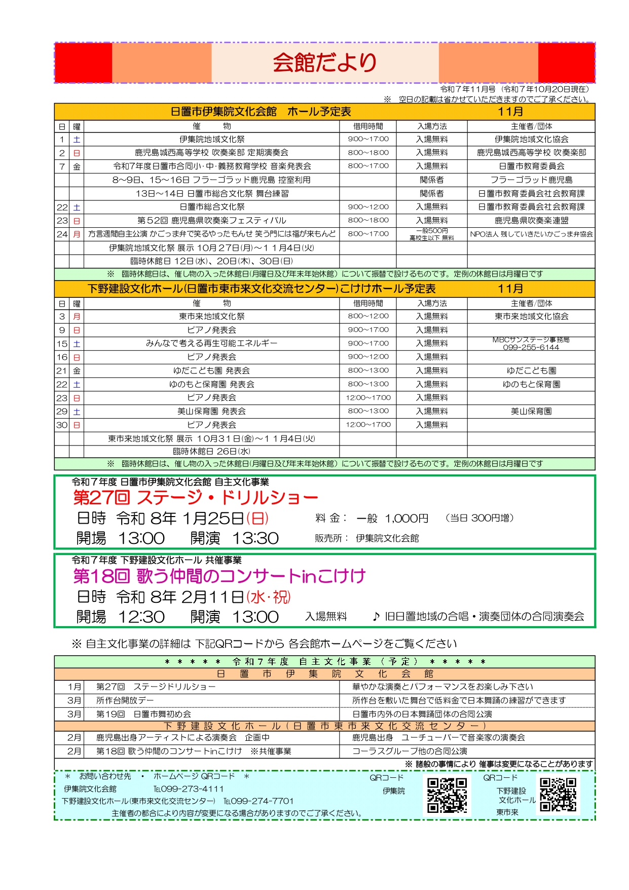 日置市伊集院文化会館と下野建設文化ホール(日置市東市来文化交流センター)の予定表や年間行事などを掲載して参ります。